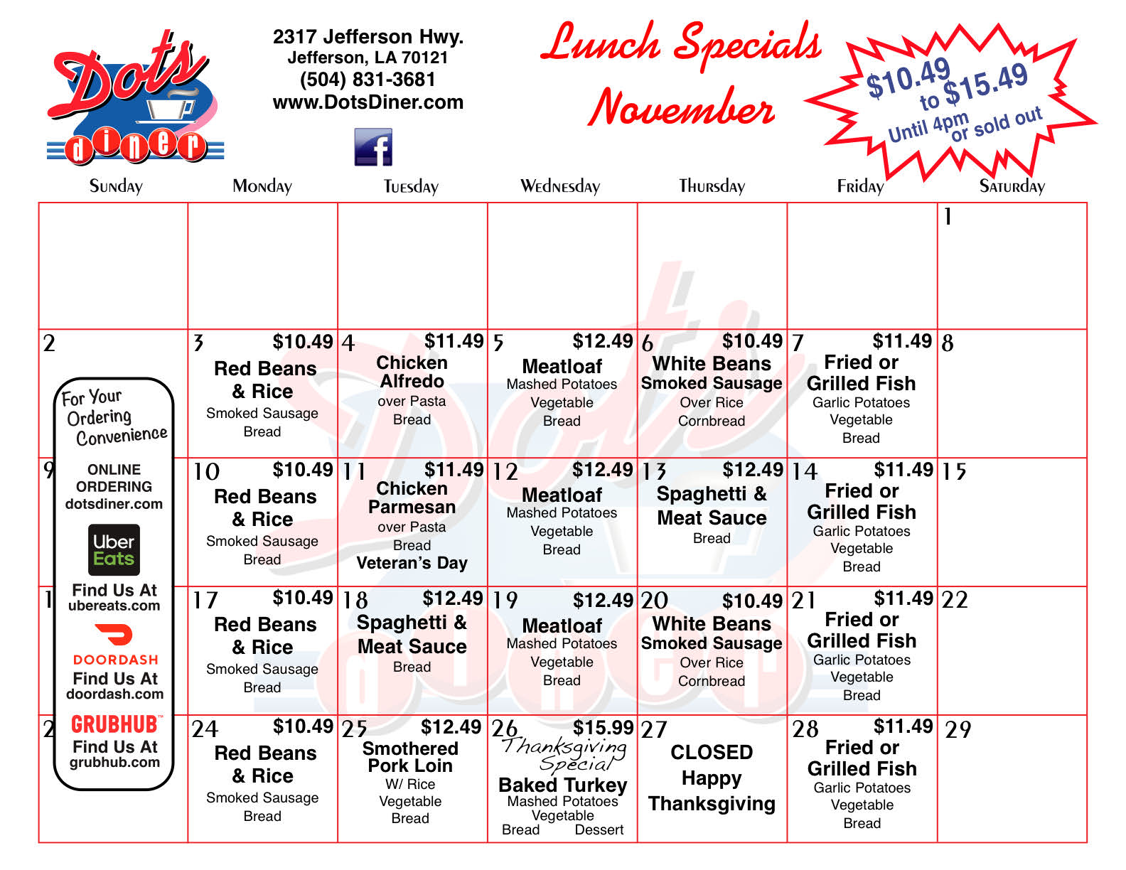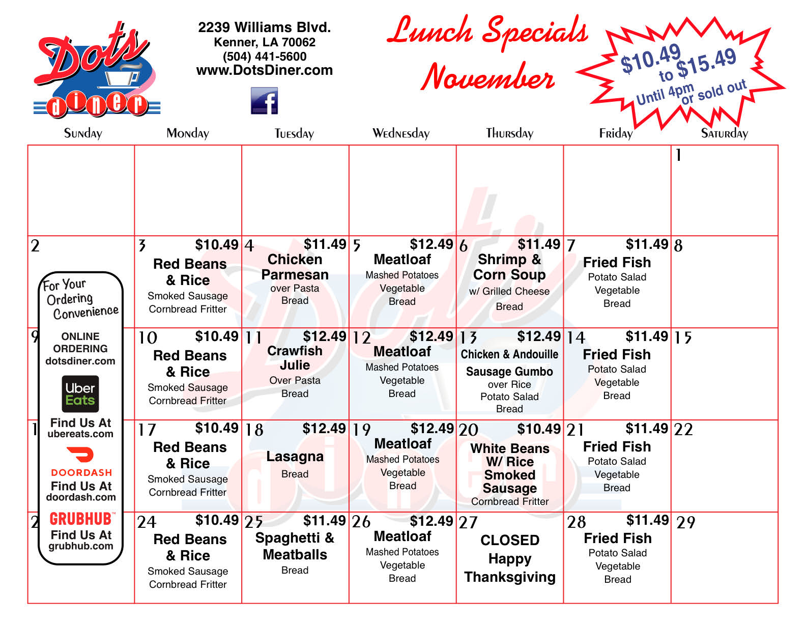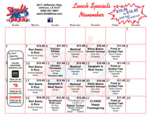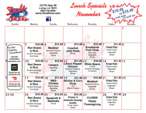 Daily Lunch Specials (click on menu to see full size) 2239 Williams Blvd, Kenner LA 2317 Jefferson Hwy, Jefferson, LA 10701 Jefferson Hwy, River Ridge, LA 12719 Hwy 90, Luling, LA